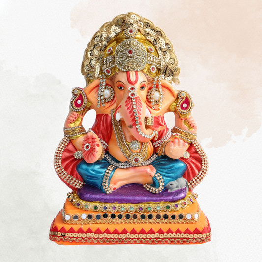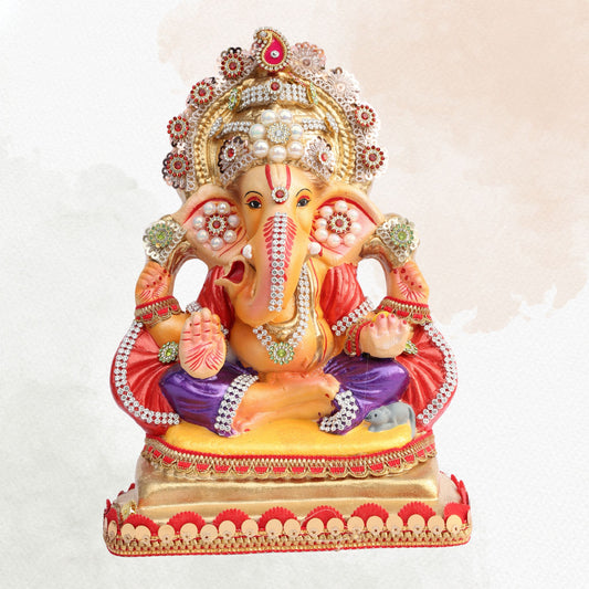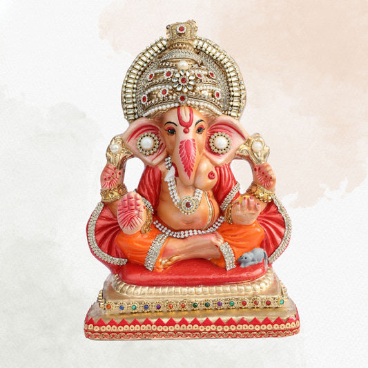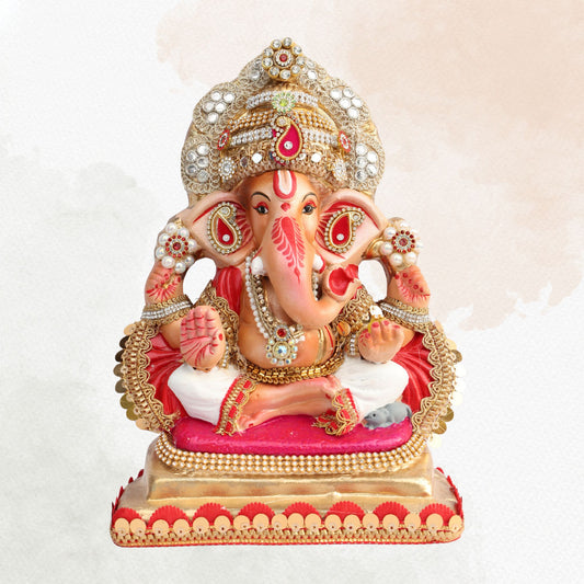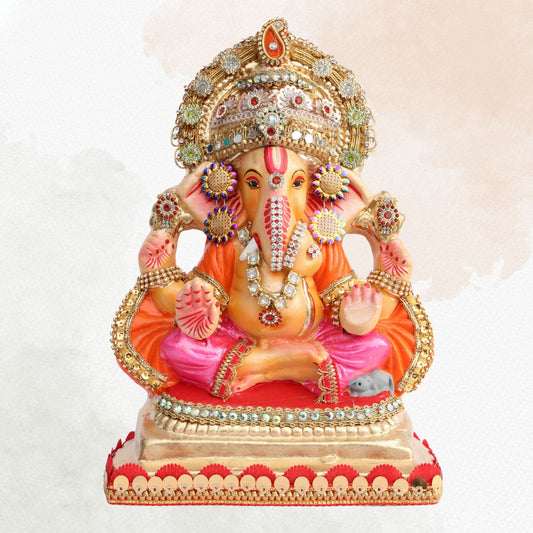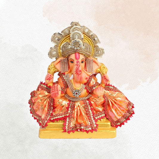 11 Inch β Ganesha Idol in Pink-Orange Attire with Grand Golden Crown | Eco-Friendly Shadu Mitti Ganpati Murti with Sparkling Detailing & Classic Seated Pose