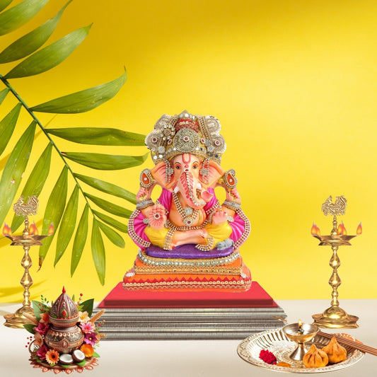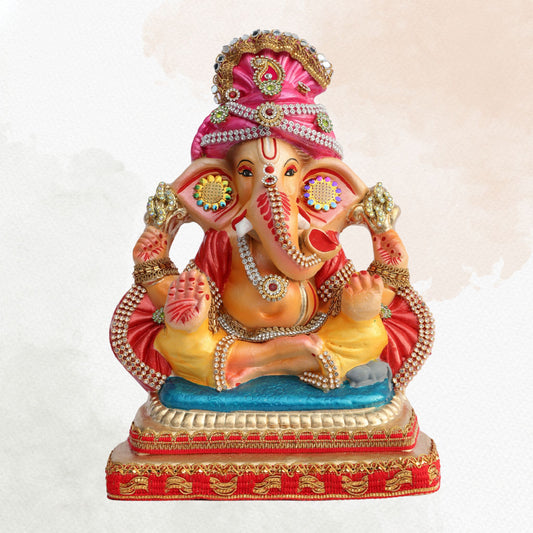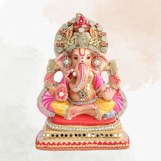 11 Inch β Elegant Seated Ganesha Idol in Pink-Yellow Attire | Shadu Mitti Eco-Friendly Murti with Heavy Golden Crown & Pearl Detailing