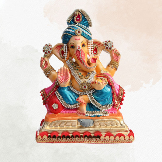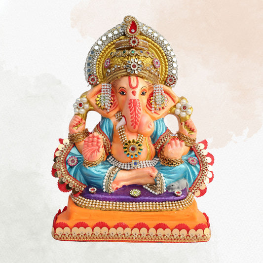 11 Inch β Elegant Seated Ganesha Idol in Blue Dhoti & Pink Shawl | Shadu Mitti Eco-Friendly Murti with Pearl-Adorned Crown & Rich Decorative Finish