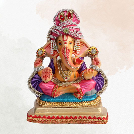 11 Inch β Traditional Pink Turban Ganesha Idol | Shadu Mitti Eco-Friendly Murti with Violet Shawl & Pearl Detailing
