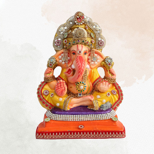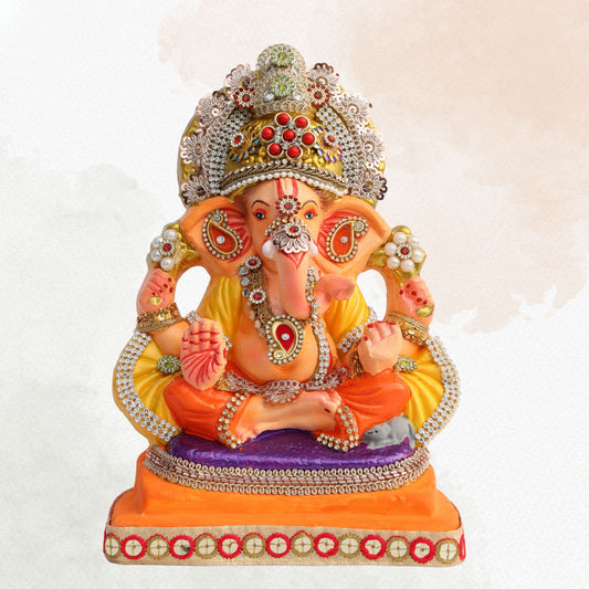 11 Inch β Ganesha Idol in Yellow-Orange Attire with Majestic Red-Green Bejeweled Crown | Eco-Friendly Shadu Mitti Ganpati Murti