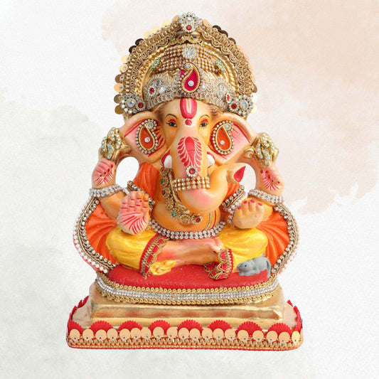 11 Inch β Vibrant Seated Ganesha Idol in Orange & Gold Attire | Eco-Friendly Shadu Mitti Murti with Pearl Crown & Lace Work
