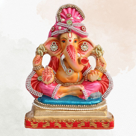 11 Inch β Seated Ganesha Idol in Elegant Pink Attire | Eco-Friendly Shadu Mitti Murti with Ornate Stone & Pearl Work