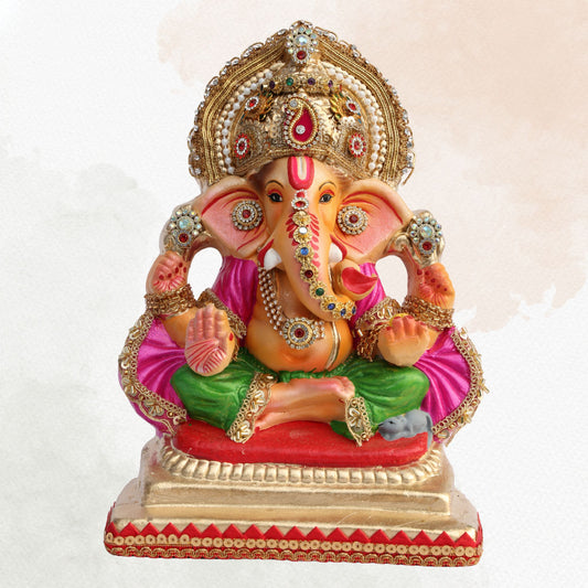 11 Inch β Traditional Ganesha Idol in Magenta & Green Attire | Shadu Mitti Murti with Kundan Crown & Ornamental Detailing