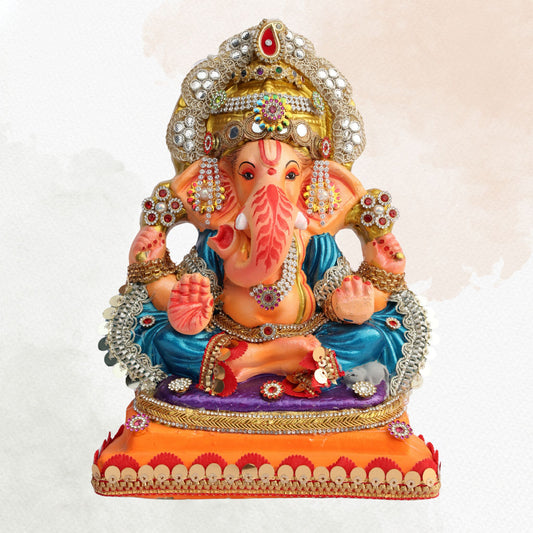 11 Inch β Royal Seated Ganesha Idol in Orange Attire | Shadu Mitti Clay Murti with Beaded Crown & Pearl Stone Work