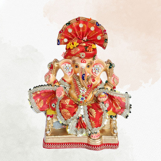 13 Inch β Royal Red Pagdi Ganesha Idol in Traditional Brocade Attire | Eco-Friendly Shadu Mitti Murti