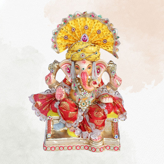 13 Inch β Majestic Yellow-Pagdi Shadu Mitti Ganesha Idol with Red Zari Attire & Pearl-Studded Crown