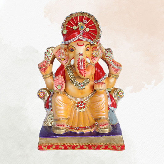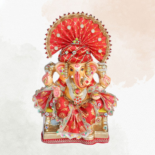 34Inch - Traditional Seated Ganesha Idol in Red Royal Attire | Shadu Mitti Clay Murti with Majestic Pagdi and Kundan Detailing