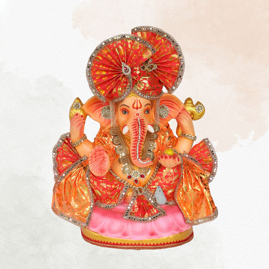 23 Inch β Traditional Orange Ganesha Idol | Shadu Mitti Eco-Friendly Murti with Red Pagdi & Pink Lotus Base