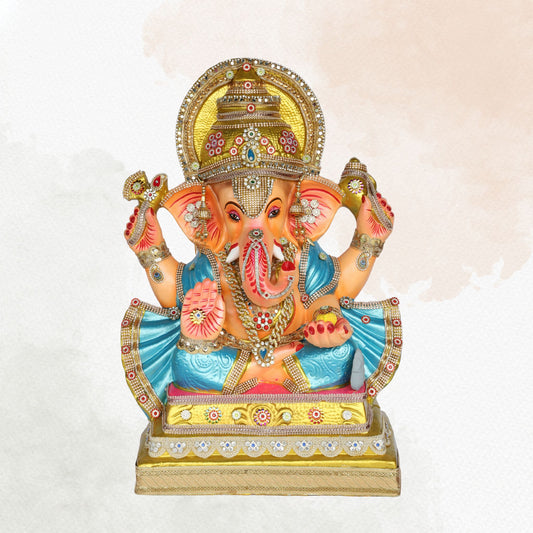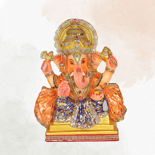 19 Inch β Grand Seated Ganesha Idol in Orange Foil Attire β Shadu Mitti Clay Murti with Designer Fan Mukut & Stone Work