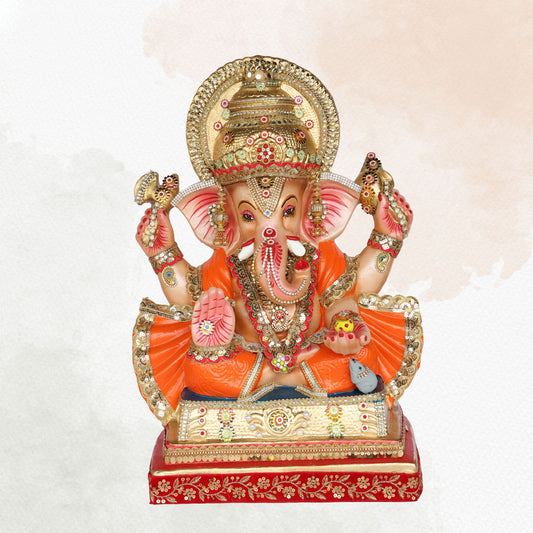 19 Inch β Divine Seated Ganesha Idol in Orange & Red Attire β Shadu Mitti Clay Murti with Golden Crown & Stone Embellishments